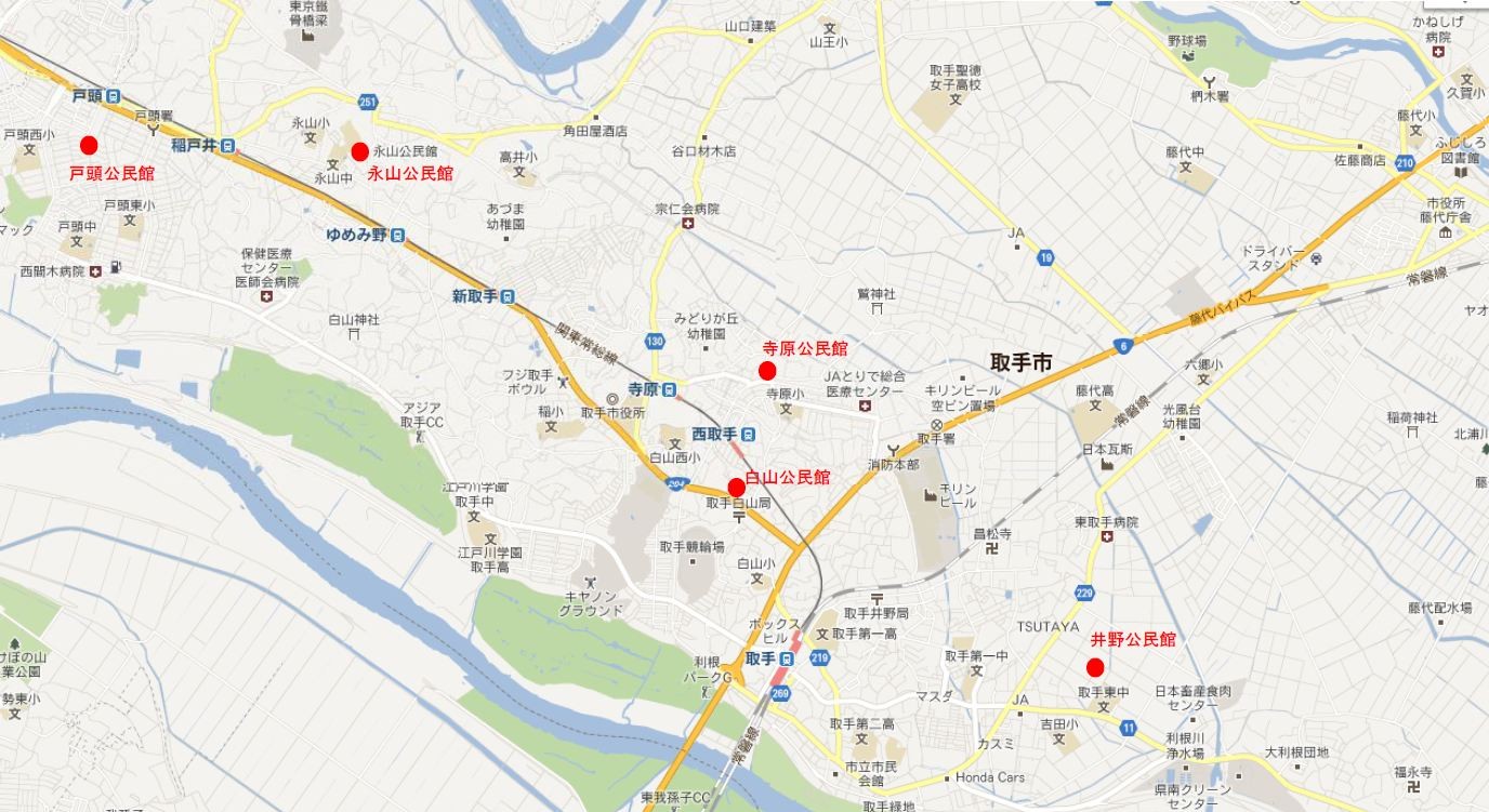 パソボラ取手は旧取手地区にある5公民館(戸頭・永山・寺原・白山・井野)で活動しています。